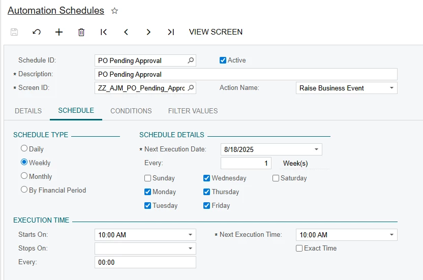 For the schedule, we decided that 10:00 AM was when approvals from the previous day were now considered late. For Schedule type I chose Weekly, as you can customize what days of the week you want the notifications to send, and I didn’t want people being told they were late over the weekend.
