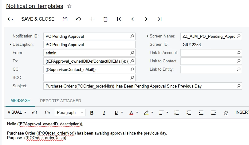 In the ‘To’ field we have the Approver who is being reminded to do the approval, and you can’t see it, but the Owner on the PO is included as well. The Approver’s supervisor is CC’d below, as we want someone to see this email if the employee is out of office.