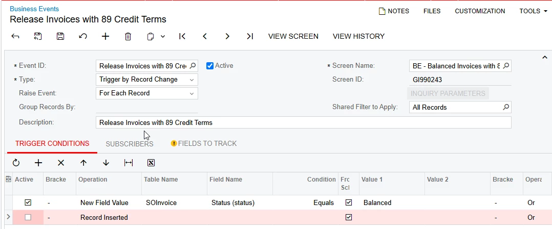 I created a GI that shows SO Invoices with a status of Balanced. I created a Business Event with this GI that fires an Action from the SO Invoice screen to release the invoice when the SOInvoice.Status changes to Balanced. This gives an error: The Release Button is disabled. However, when I go look at the invoice the Release Button is enabled and I am able to release the invoice. I am guessing it is some type of timing issue with the Business Event above since the completion of that would trigger this Business Event.