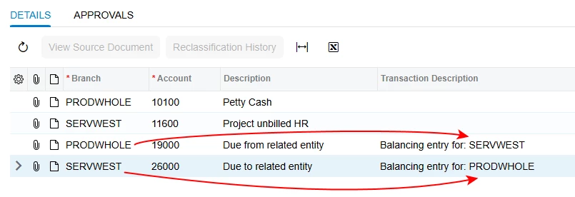 It is not helpful to see PRODWHOLE has a transaction that is a balancing entry for PRODWHOLE. It would be more useful to the person reviewing the transaction to know that the branch PRODWHOLE has a balancing entry that came from PRODRETAIL.