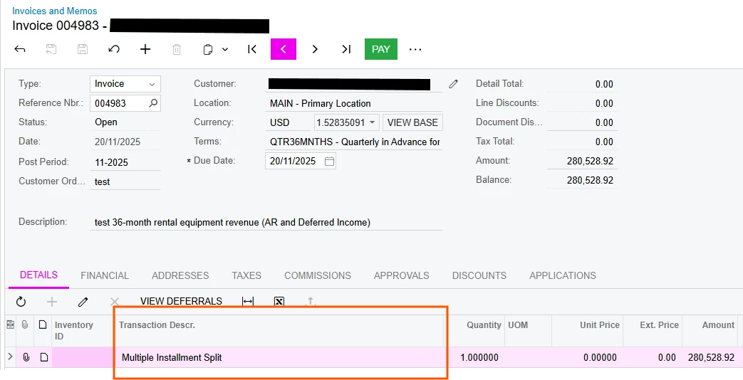 Currently it generates the invoices with “Multiple Installment Split” as the description. Ideally, we’d like it to either copy the transaction description from the original invoice or not automatically post the invoice so that we have the opportunity to manually adjust the description (i.e. maybe we’d write 1st Installment/2nd Installment/etc., or Installment for Dec-2025/Installment for Jan-2026/etc.).