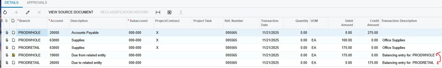 It is not helpful to see PRODWHOLE has a transaction that is a balancing entry for PRODWHOLE. It would be more useful to the person reviewing the transaction to know that the branch PRODWHOLE has a balancing entry that came from PRODRETAIL.