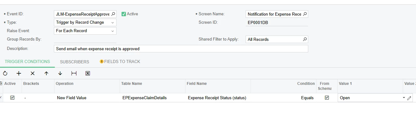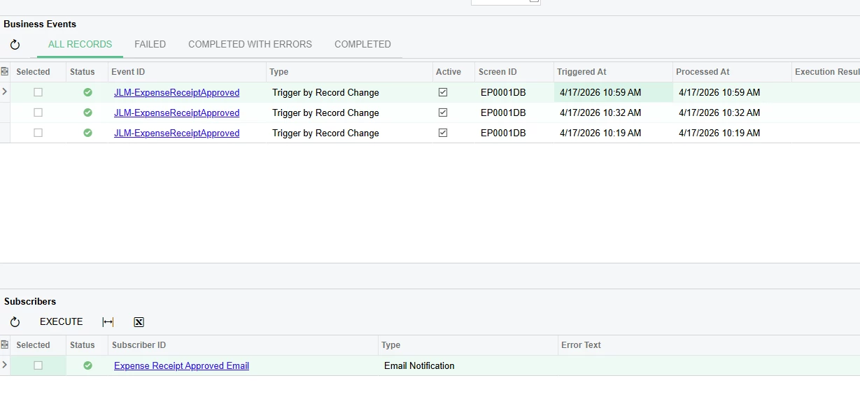 I actually did just try your suggestion which did trigger the business event but the email notification never was sent… which is really strange. For that approach I basically just took my existing custom GI and set conditions to make it only approved receipts and triggered on insert like you said. Below you can see the event did actually trigger and I can see the email subscriber.. but there is no email going out, even when checking the All Emails list.