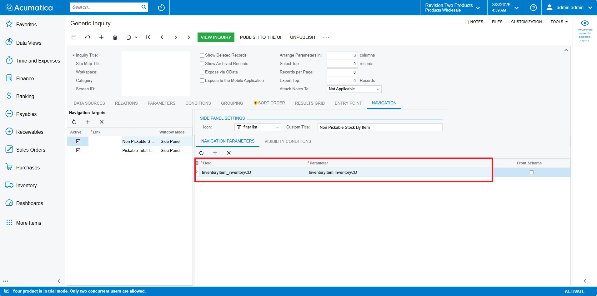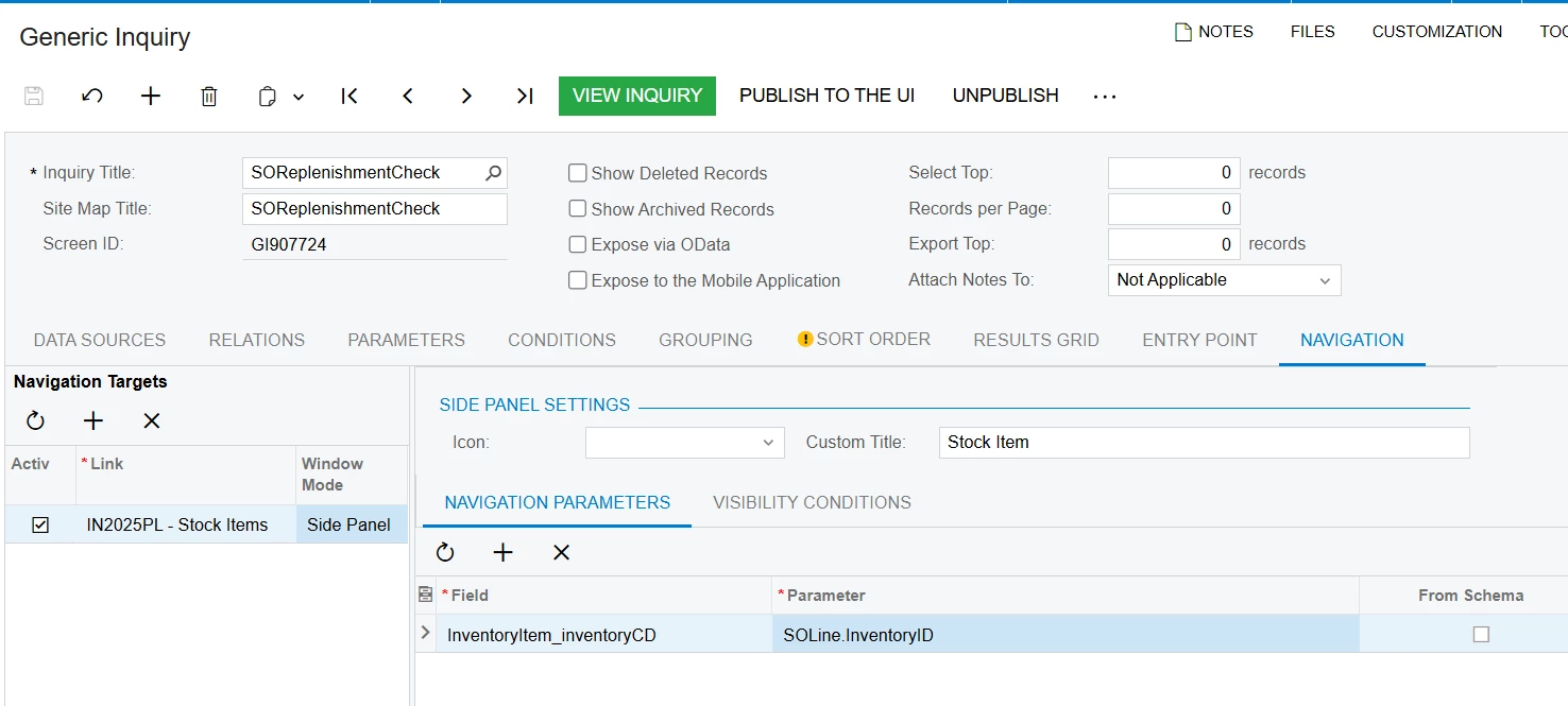 For the side panel link condition, I am currently using: InventoryCD = InventoryCD