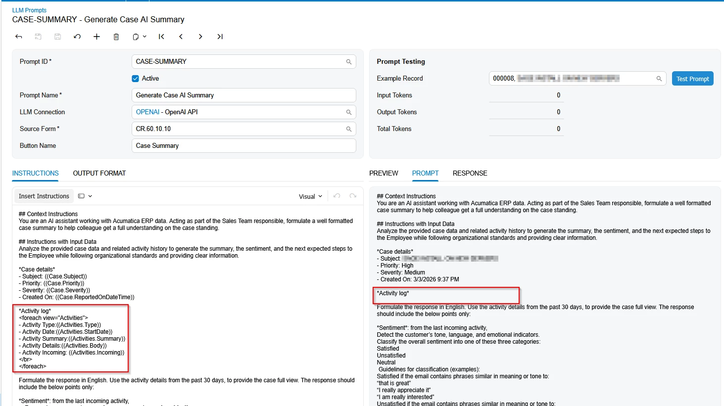 Formulate the response in English. Use the activity details from the past 30 days, to provide the case full view. The response should include the below points only:The prompt shows the following without showing any of the activities that are on the case :