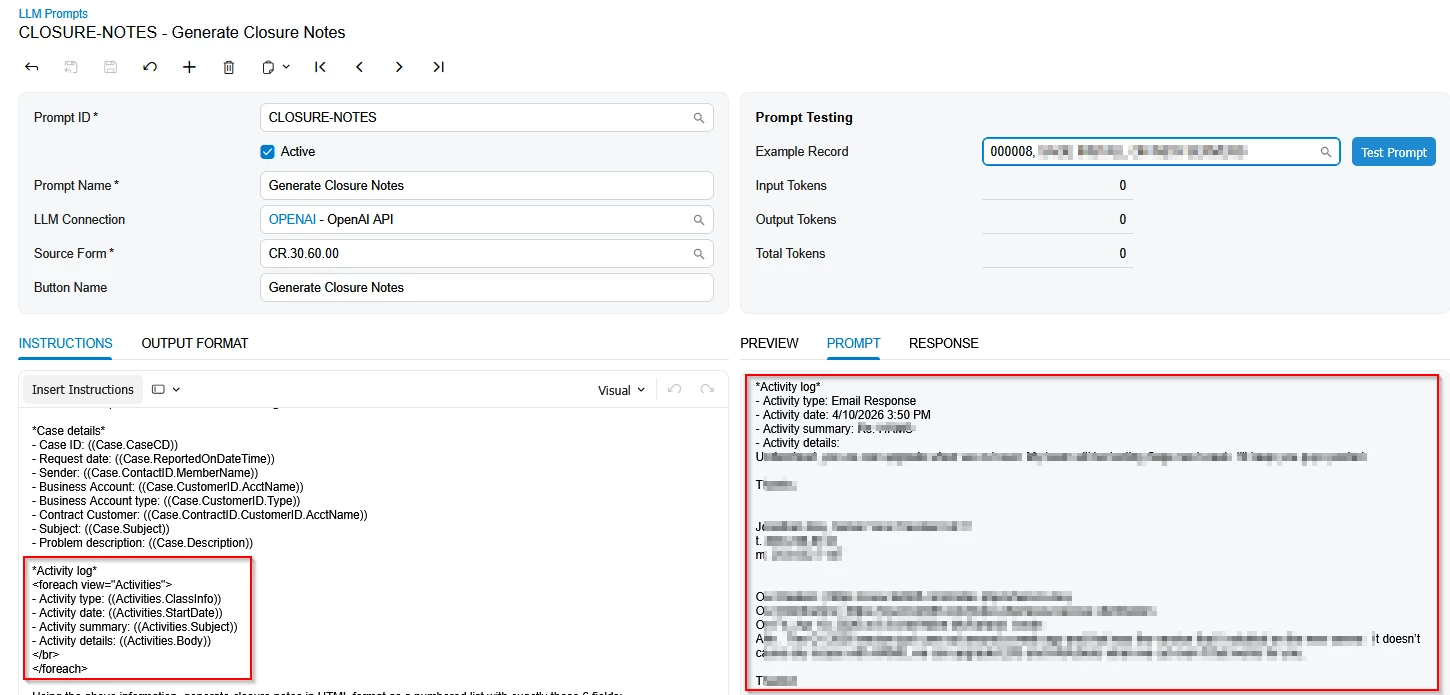 Compare to the CLOSURE-NOTES prompt which has similar instruction block and does show activities.