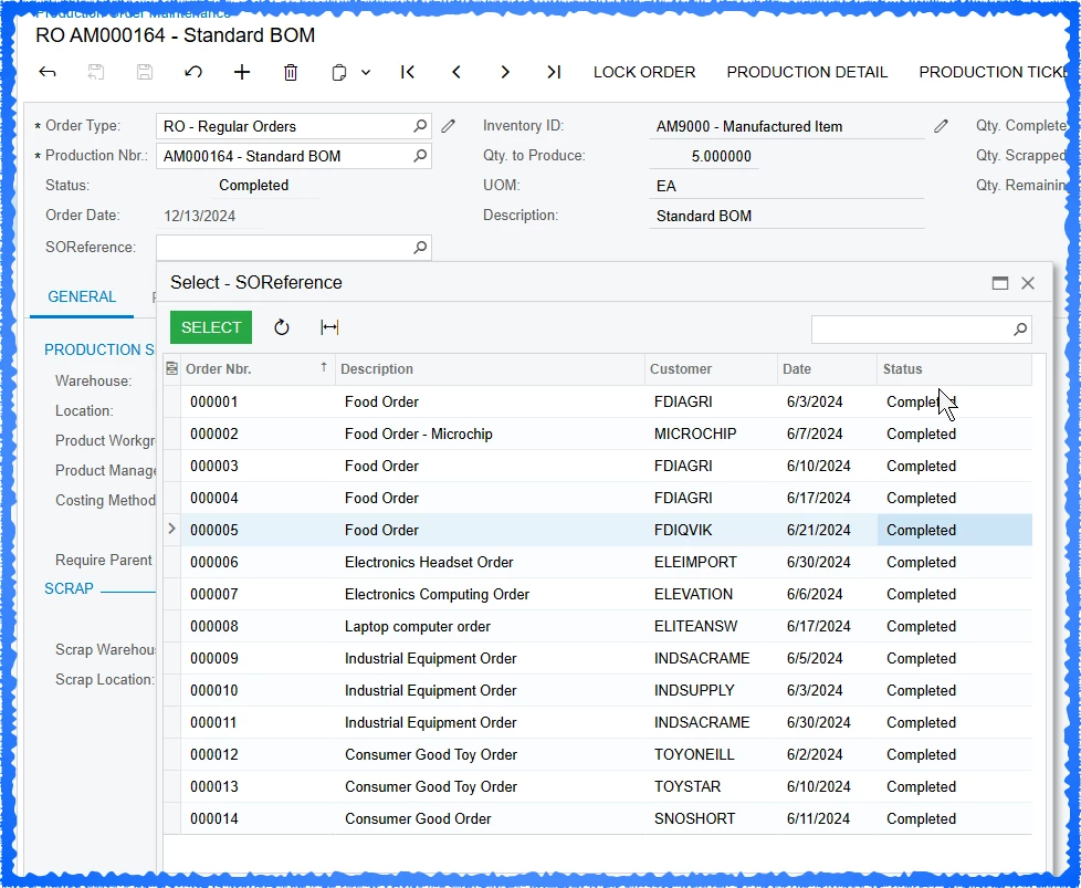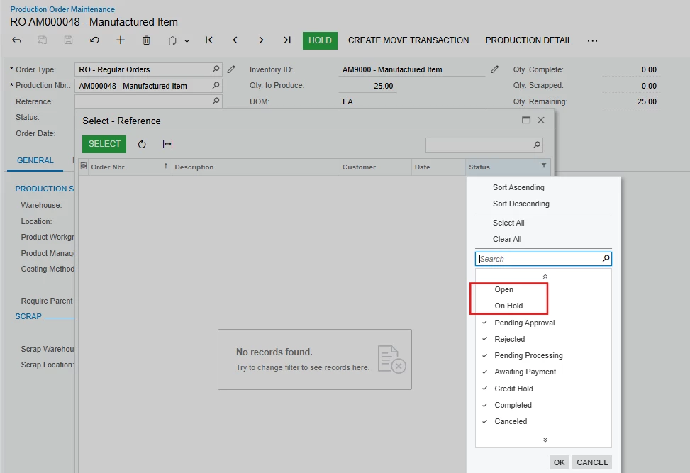 I’m playing around with customizations and trying to add a sales order reference to the Production Order Maintenance screen. When I open the selector, it’s not only showing the results that are open or on hold. How can I have it filter the results just to those two values?