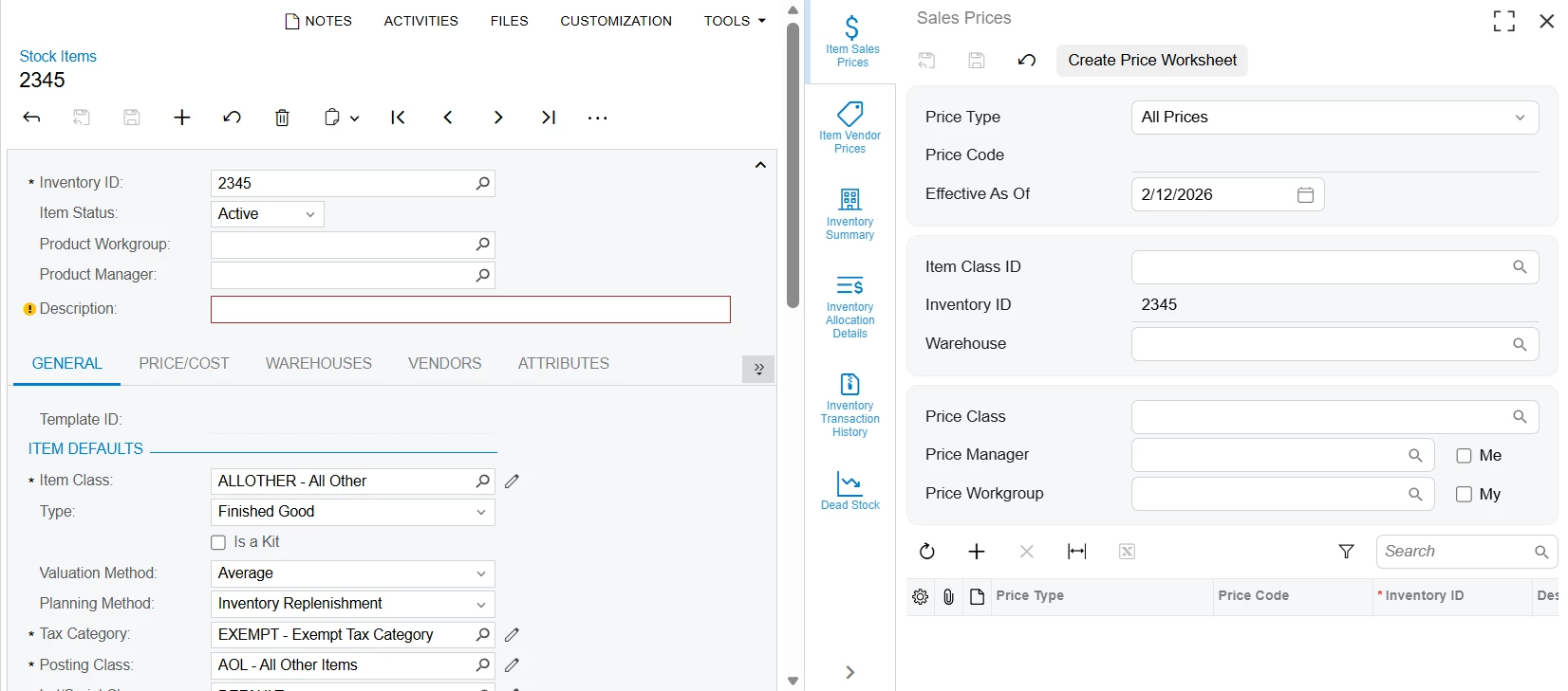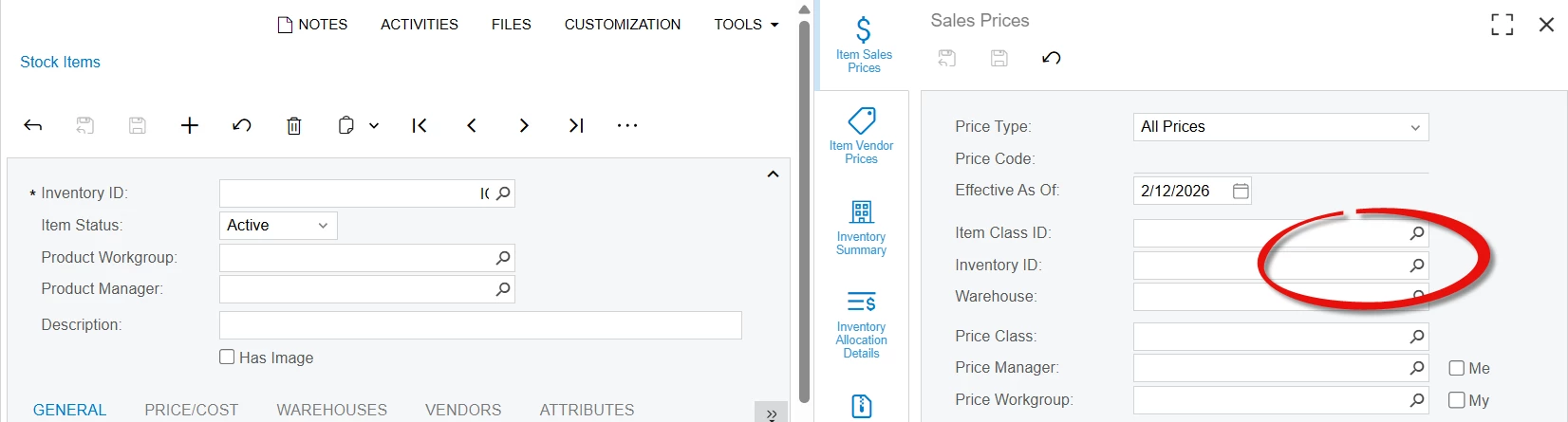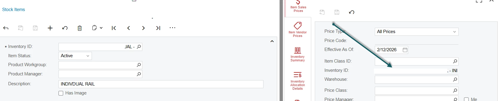 On the "Stock Items" screen IN202500, side panels "Item Sales Prices", "Item Vendor Prices", "Inventory Summary", "Inventory Allocation Details", "Inventory Transaction History", and "Dead Stock", the "Inventory ID" field is not able to be changed 25R2. In 2024R1 thee sub-panels open with the selected stock item applied in the filter, but the user is able to change the Inventory ID once the side panel opens.