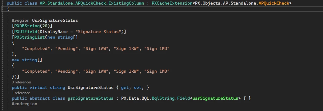 [PXDBString(20, BqlField = typeof(APRegisterExt.usrSignatureStatus))] Repeat this pattern for any other fields.