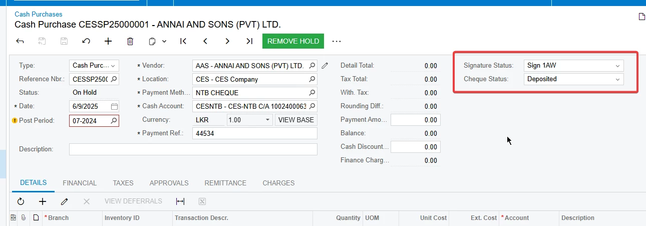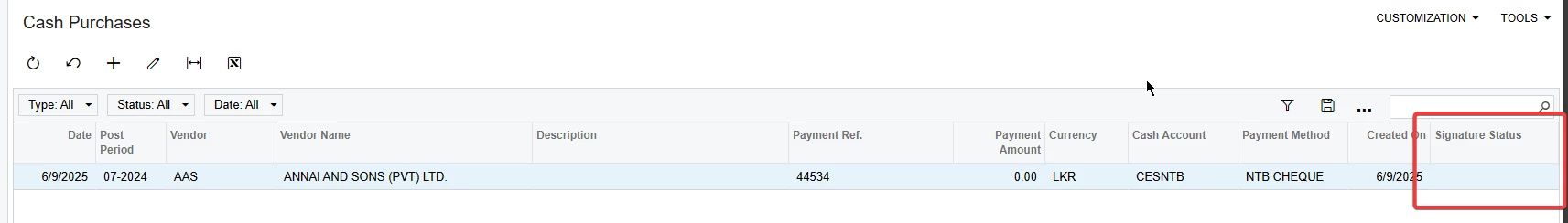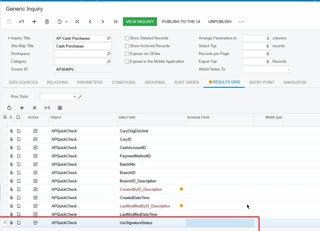 I have created two custom fields in Cash Purchase, but their values are not displaying in the Generic Inquiry.