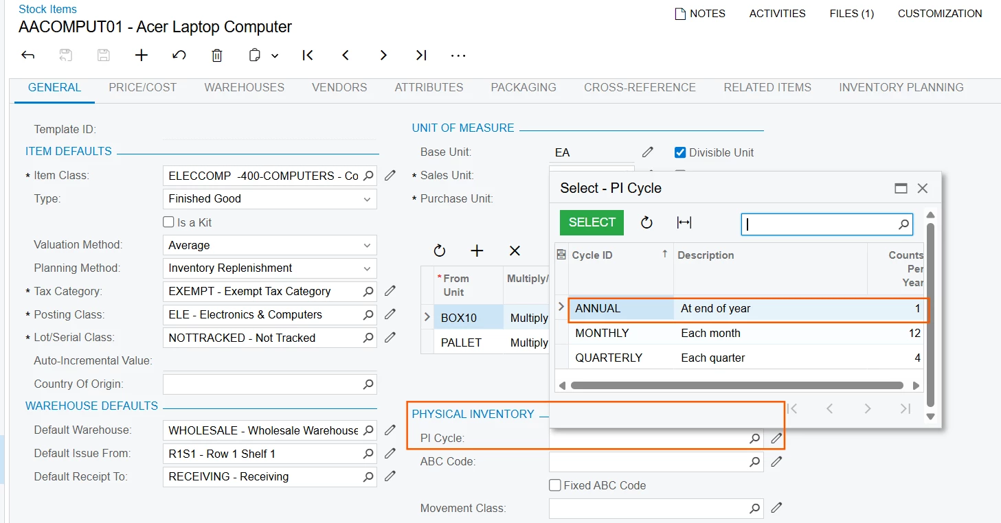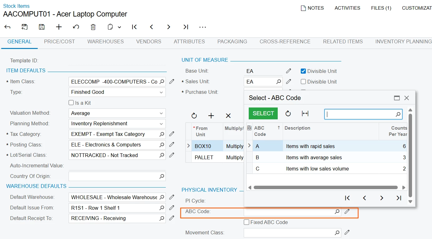 Very new to Acumatica, so all apologies now :). I created my codes as you can see below. How do I make them now go into effect? I see Update ABC Code but I can only see that by month. I want every stock items to be assigned a A, B, or C based off it’s avg BOH dollar amount for lets say over the last year.