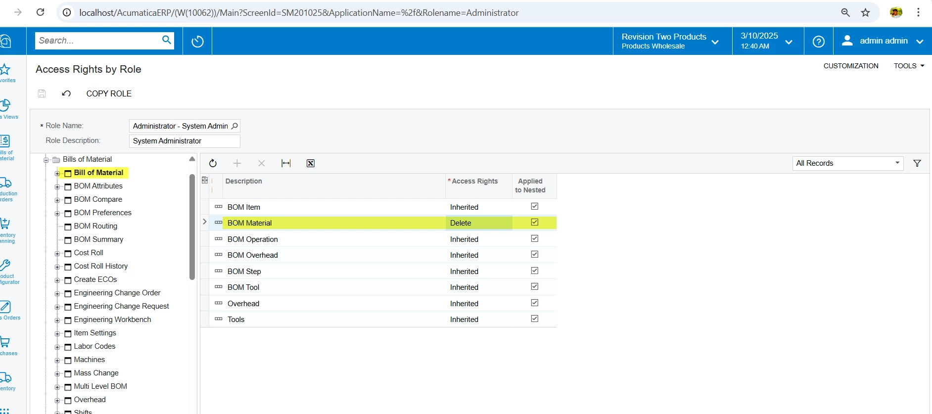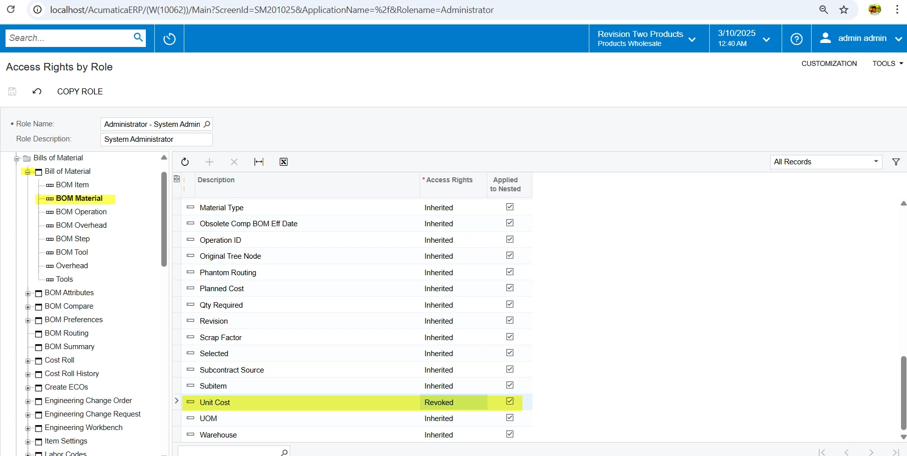 I want to grant access to an existing Acumatica User Role to View Only rights for Bill of Material. I grant that access via Bills of Material > Bill of Material. However, the owner doesn’t want the users to see the Unit Cost and Planned Cost data fields for Materials.