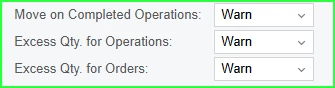 The only check is for under issued materials in the Data Entry section of production order types; if you are backflushing materials on the Move, that will prevent the production order completion is you set the Under Issue Materials to Do Not Allow..  If you have Allow Backward Reporting set in the Order Type any unreported operation quantities are set to the qty completed from the next operation.  If you are using the Estimated Costing method for production orders the labor cost from the Move, if any, has been factored into the receipt cost of completed item as well as any materials not issued.