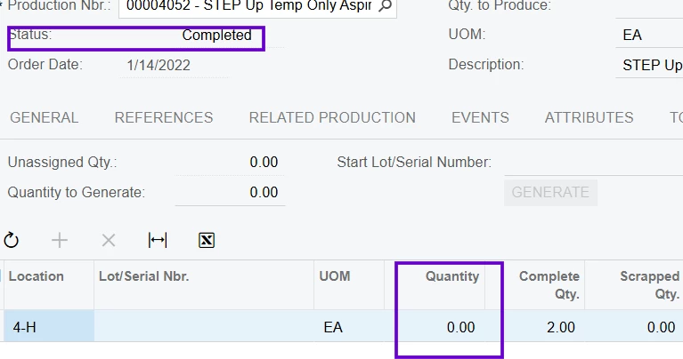 What is the recommended fix for old production orders where the split record has 0 qty (update split, clear allocation, add a completion, etc.)?