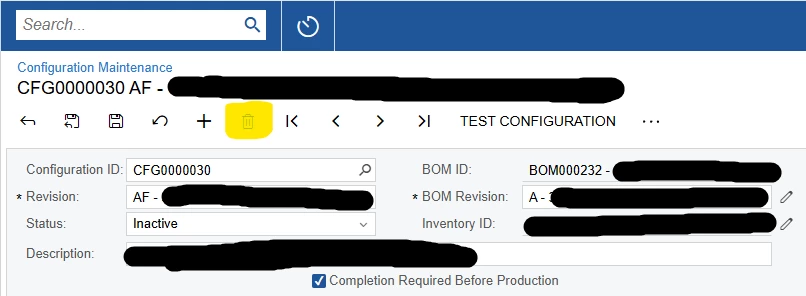 In the product configurator module, I made a new revision (AF) on CFG0000030, but in doing so, I made a sizable error that I cannot easily undo. What I want to do is delete revision AF, go back to revision AE, and have that be the basis for yet another revision for the rest of the edits I need to make. However, the system does not allow me to delete revision AF. I can only inactivate it. If I do this, AF remains the basis for the new revision (call it ‘AG’). Is there anything I can do here?