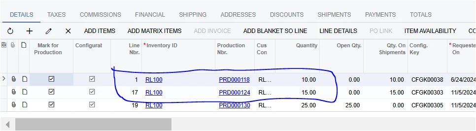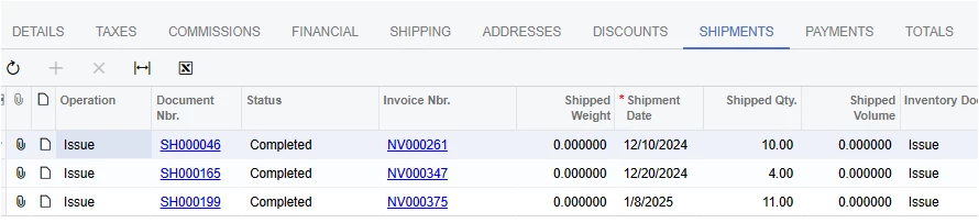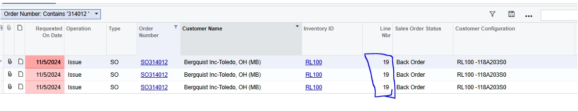 Below we have made three shipments on this sales order and the remaining line on the order shows up 3 times.