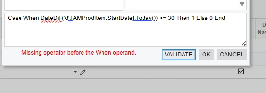 Case When DateDiff('d',[AMProdItem.StartDate],Today()) <= 30 Then 1 Else 0 End