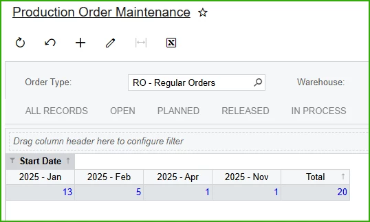 Just create a Pivot table from the Production Order List for open orders. Values are a count of the ProductionNbr, column is StartDate It will be close enough or add a column to count the days from the start date to today, The sales demo data in 25R1 is old.