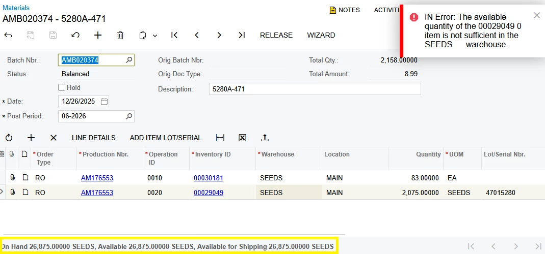 This is happening for all finished products we are making using the item 00029049, regardless of lot. We had previously made production orders using this item numerous dozens of times before, most recently just four months ago.