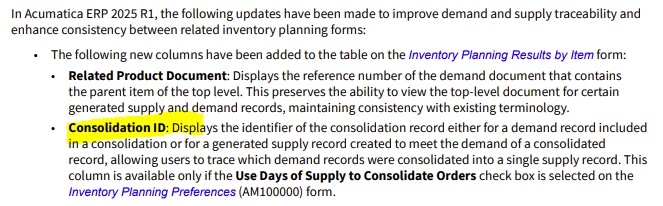 In 25R1, Inventory Planning Results by Item was enhanced to display a Consolidation ID.
