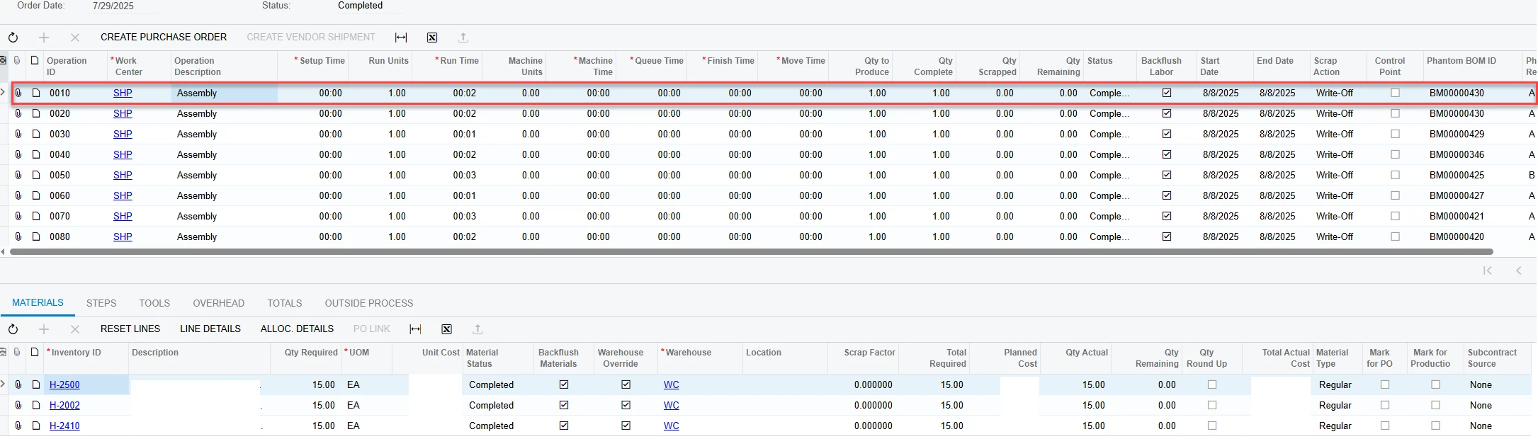 The materials seem to get calculated correctly and lists the total qty of the subparts under each operation ID correctly.
