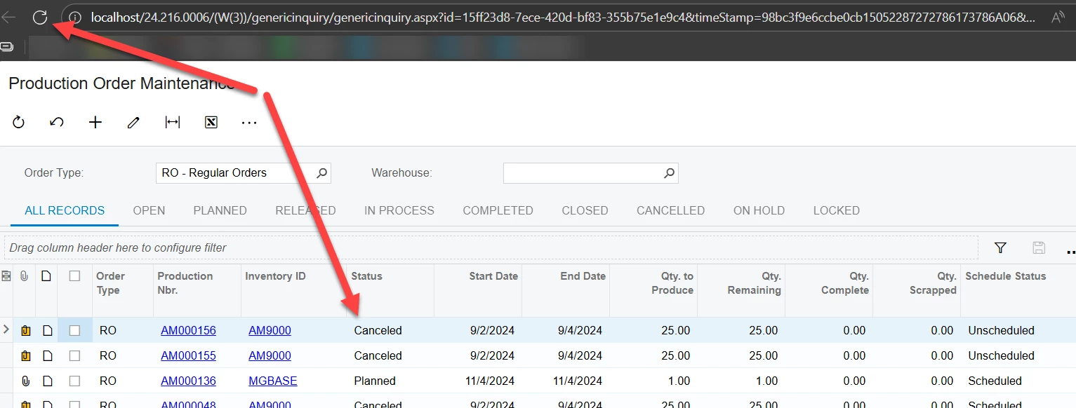Has anyone seen this error? I added Mass Actions to a GI for Production Order Ticket, but when I try to mass edit them or even one, I get this error. I was looking to complete or cancel multiples at once.