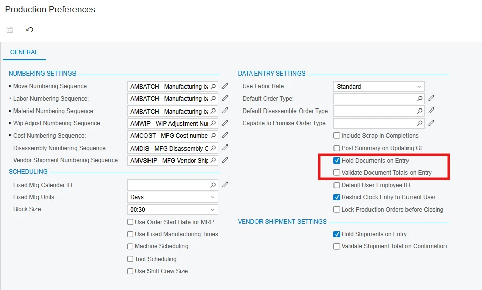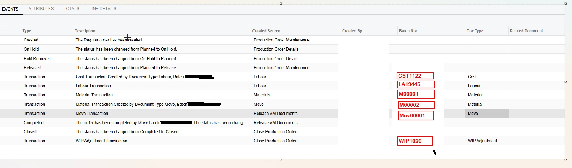 We reviewed two Production Orders for the same Item Code, and confirmed that both orders have the same Event History and appear to be configured identically.