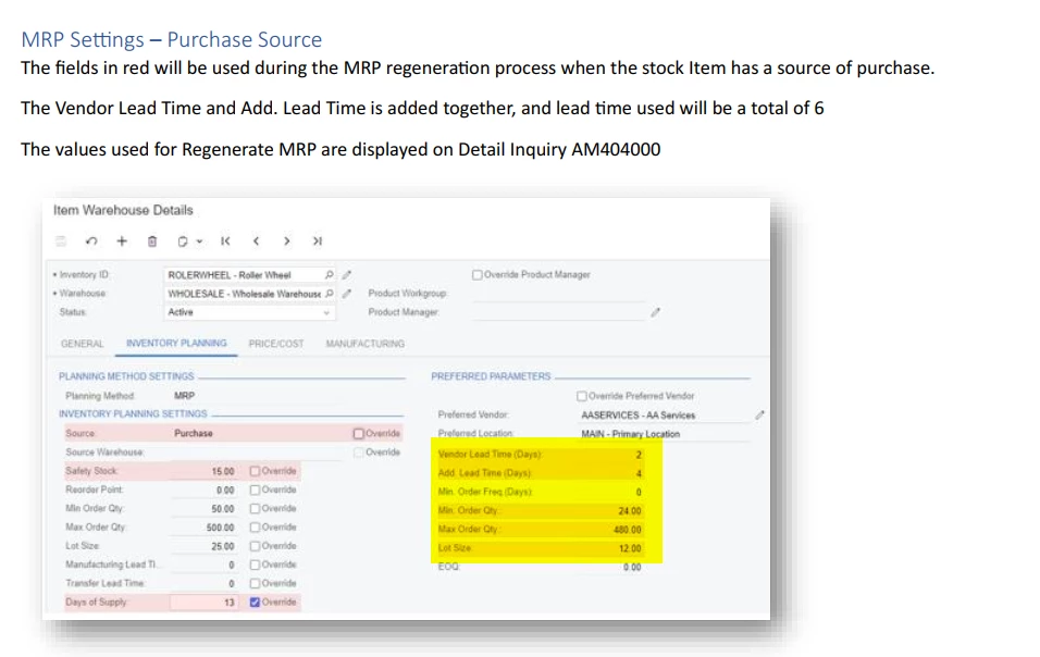 A2 - No. In your version, the configuration exists only at the system/global level. We are working to change this for 2026R2 or later. Additionally, MRP does not consider min/max values - these fields exist to support the Inventory Replenishment function.