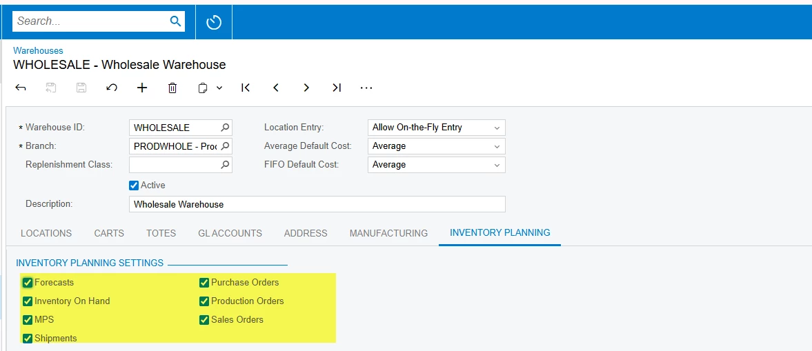 Inventory Planning is enabled at the location level as well as on the Manufacturing tab, and all the required settings are enabled.