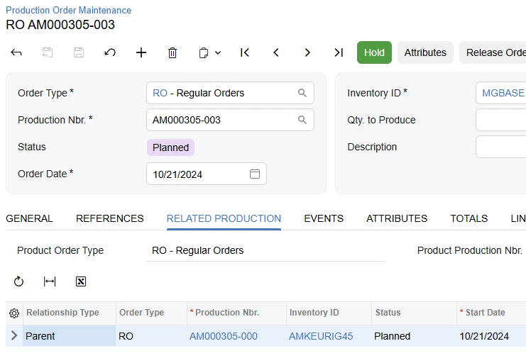 Is there any functionality in Acumatica where you can enter a production order number and a list of child production orders are display and you can select which child production orders you want to process moves/completions on?