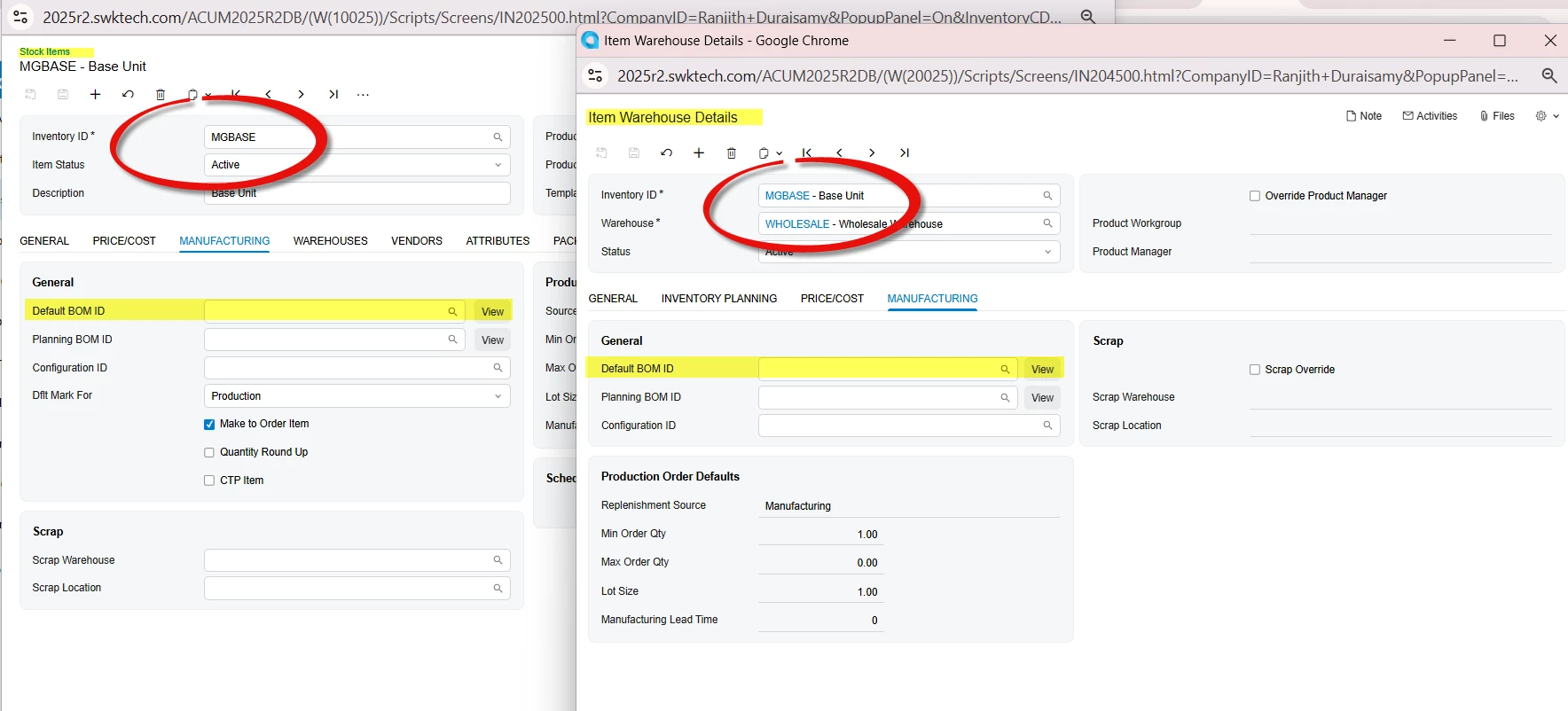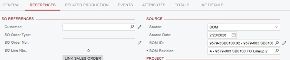 2. In the Production Order Maintenance – Reference tab- when using an Inventory ID that already has a BOM assigned, should the system automatically pull the BOM ID and Revision?