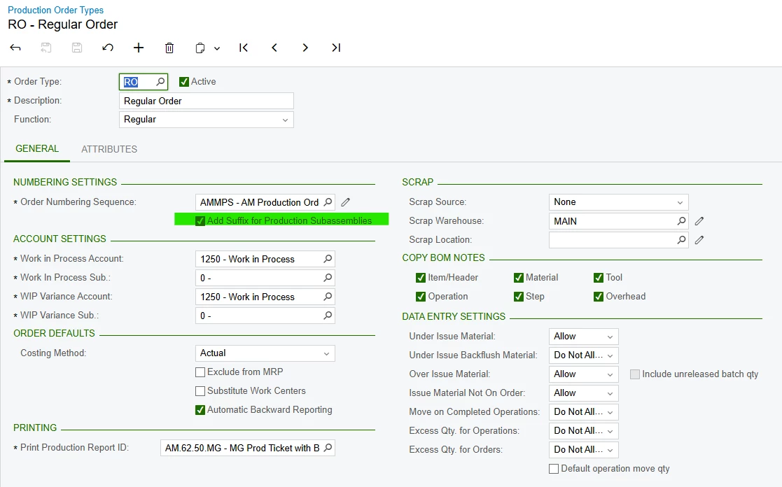 I was wondering if anyone had this issue when using this setting on the Production Order Types screen.