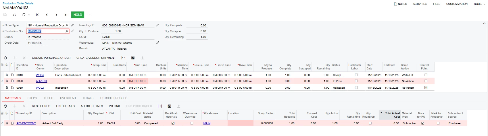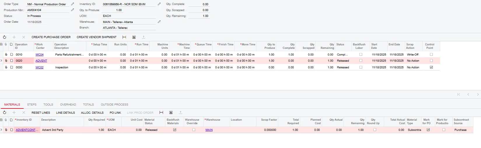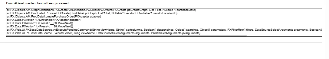 I’m trying to produce a PO for a outside process production order, and keep getting the “At Least one item has not been processed” and the PO isn’t created. The trace log doesn’t seem to give any indication of what the error could be or how to solve it. I’ve attached images of the PO and Trace Log for reference.