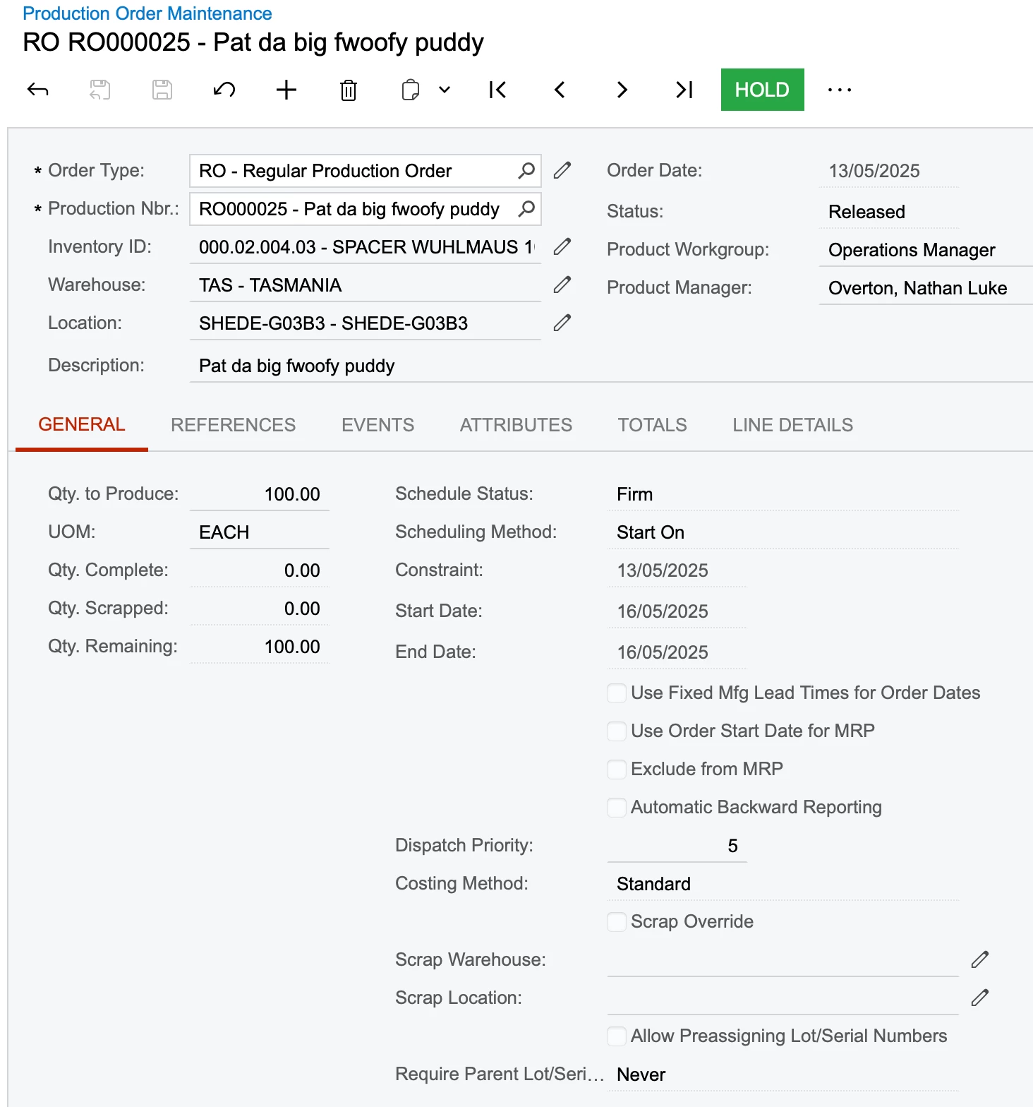 (Obviously) this is a test order from our sandbox tenant. We’re trying to come to grips with the process here, but we are stuck. This order at “Released” status, but the ellipsis menu is pretty much all greyed out, and we can’t add a labor transaction. Can you help us solve the mystery?