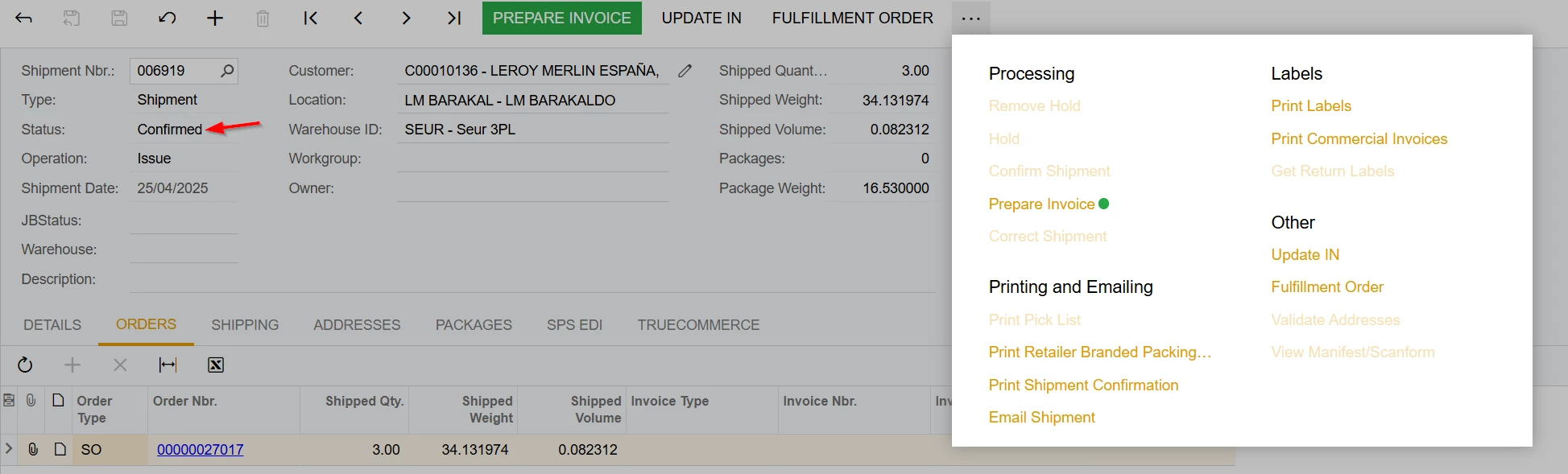 We’ve processed a shipment for the full line quantity but needed to only ship a partial. The shipment is now in Confirmed status. No invoice has been created as yet.