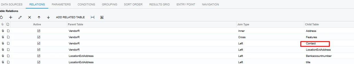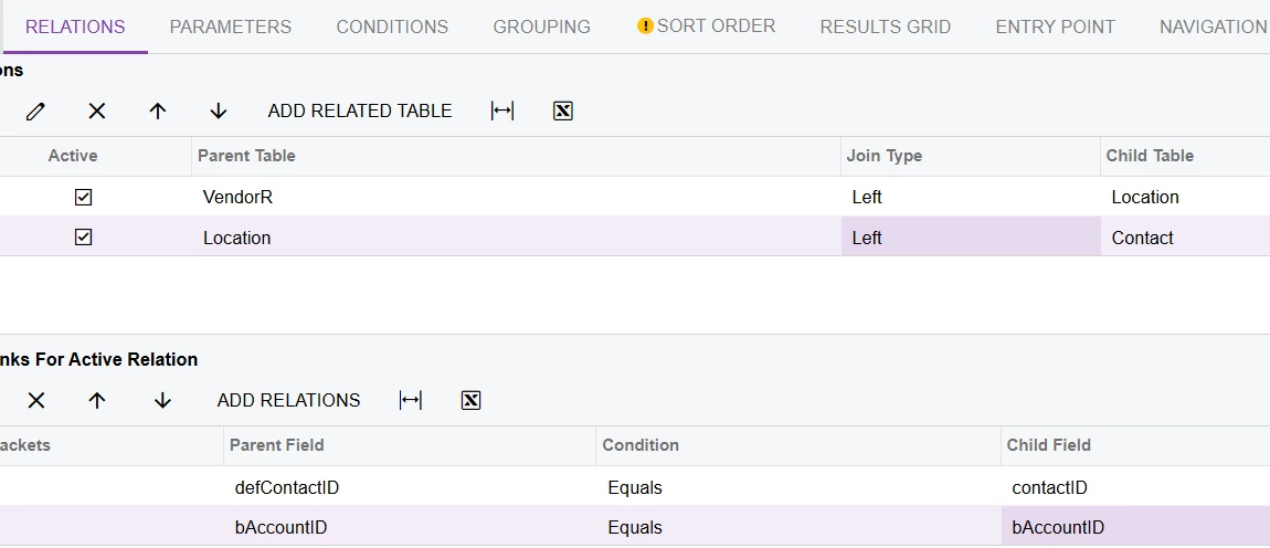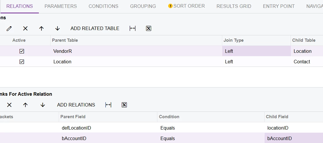 To display Email from Purchase Settings tab you need to define the relationships between the tables so that VendorR is connected to Contact through Location (VendorR → Location → Contact).