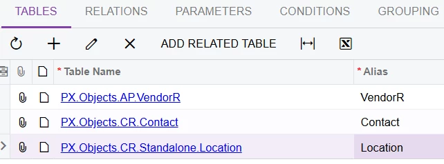 If you need to display data from both the General and Purchase Settings tabs, you can add the Contact table twice by specifying different aliases.