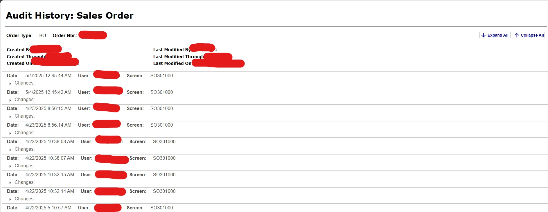 Below is the query I have created according to my understanding for the Sales Order Screen (SO301000). Is it correct to check the history for every OrderNbr.