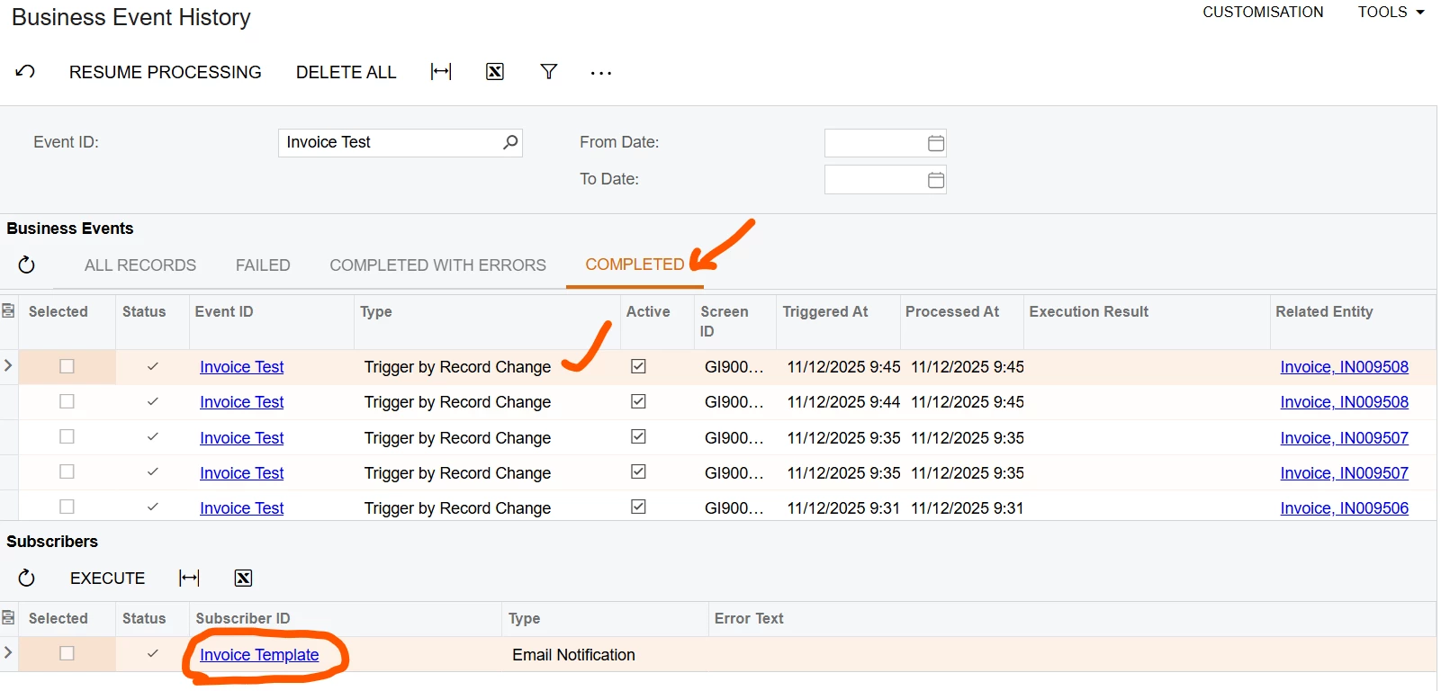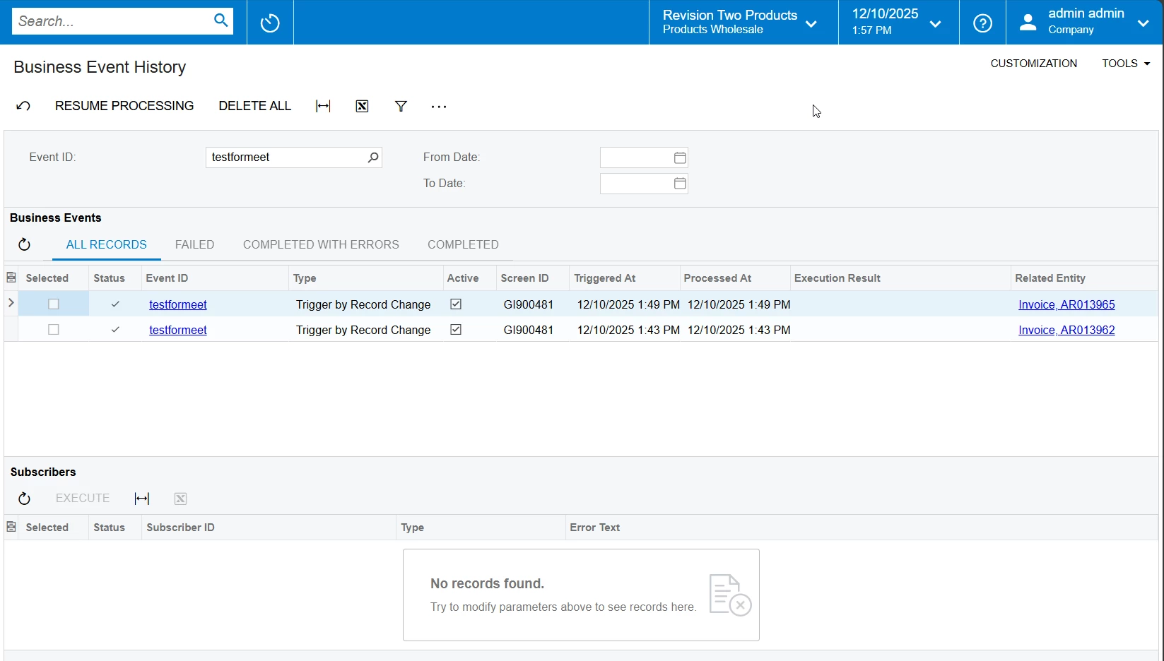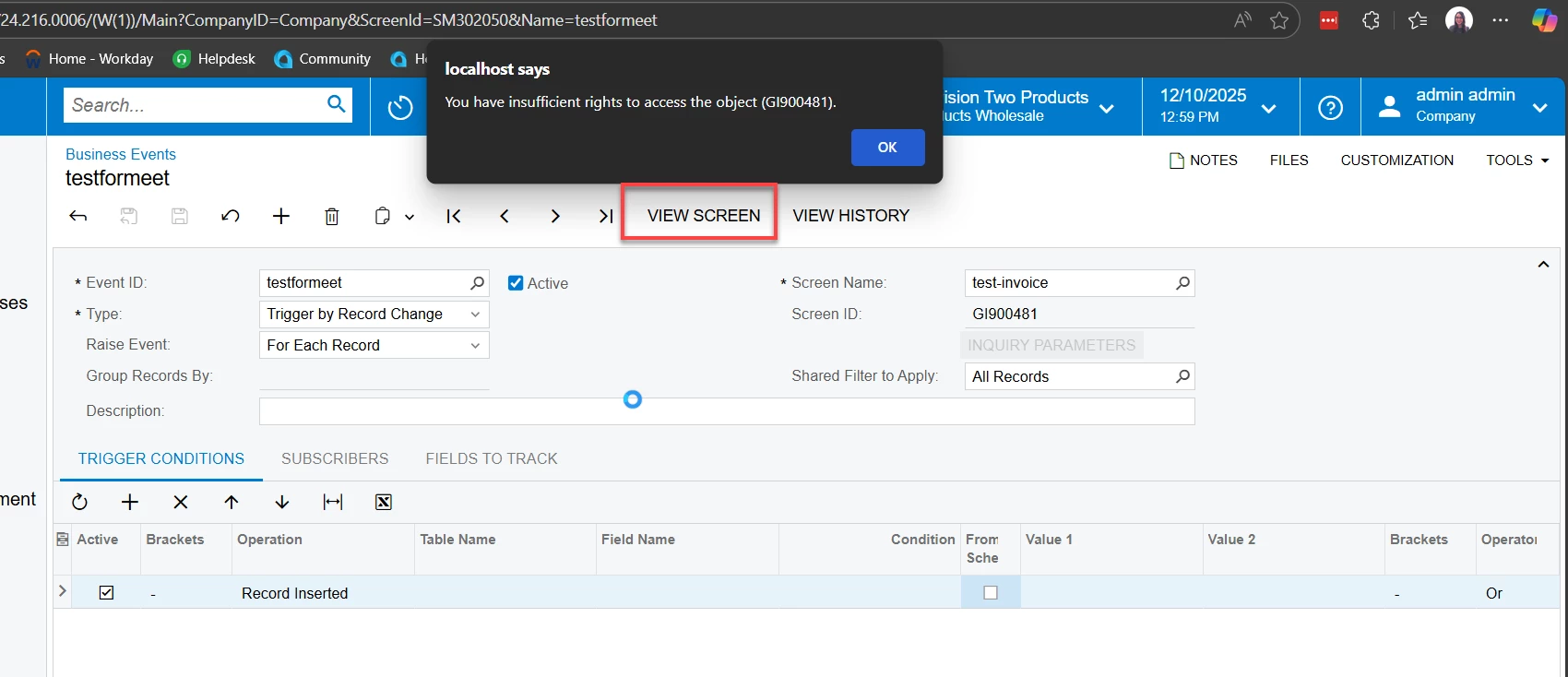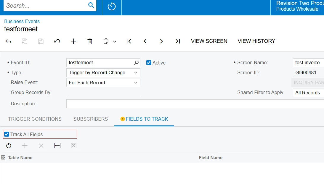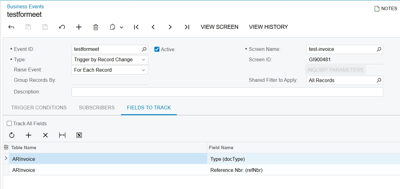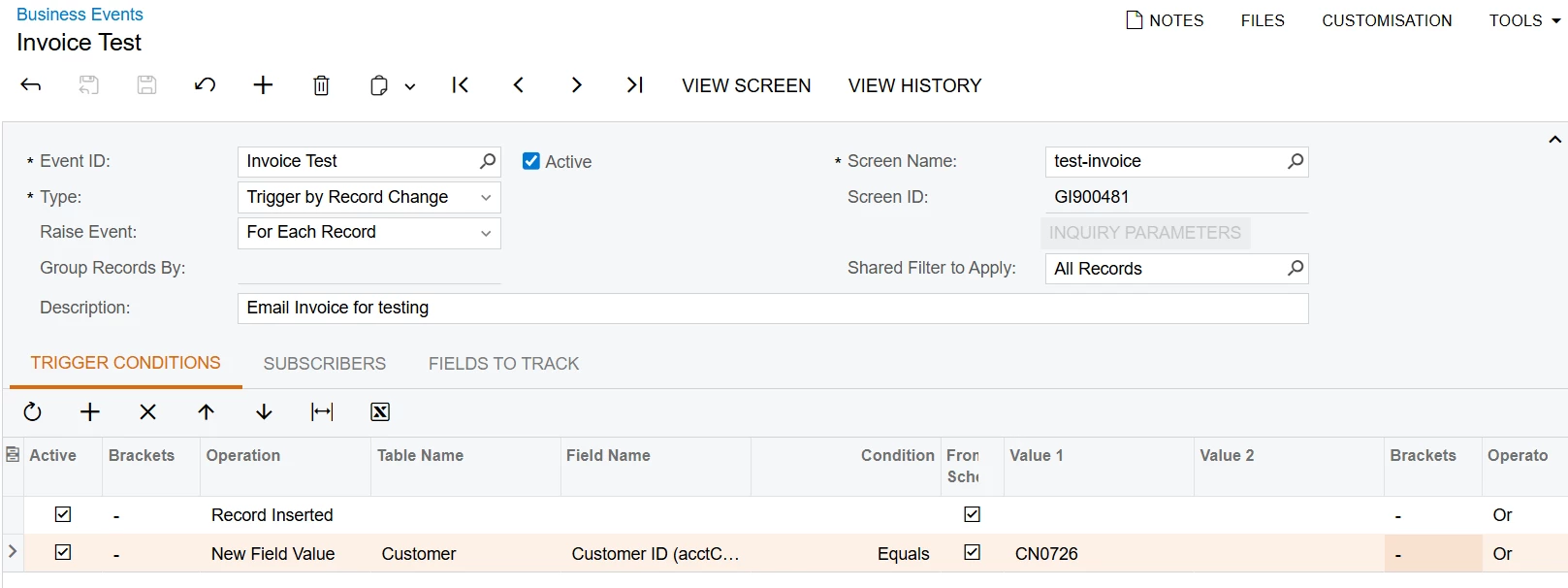 4. Created a new business event of type Record Change which is triggered whenever a new record is inserted in the GI.
