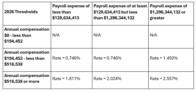 The tax wage base increased from $12,500 to $14,500. The new employer rate remains 1.2% in 2026 pending any updates from the agency.