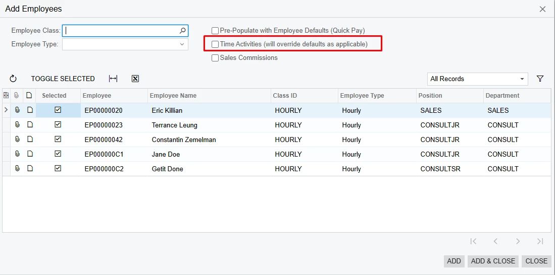 In the Payroll Batch on the Add Employees pop-up, you can select the Time Activities box and it will bring in the time activities for the selected employees.