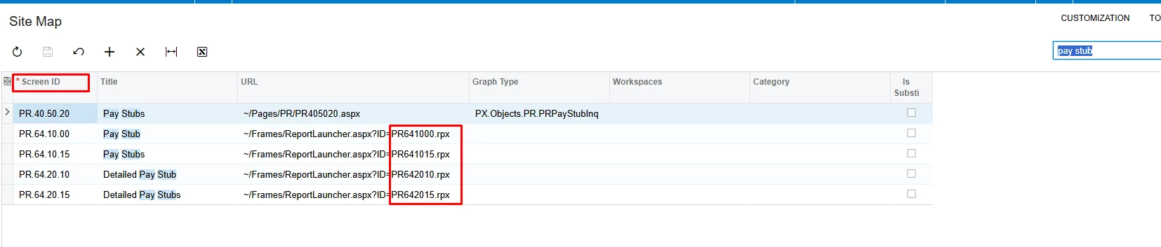 If you go to the site map, you will be able to search Payslips and it will show you the screen id and the report id.