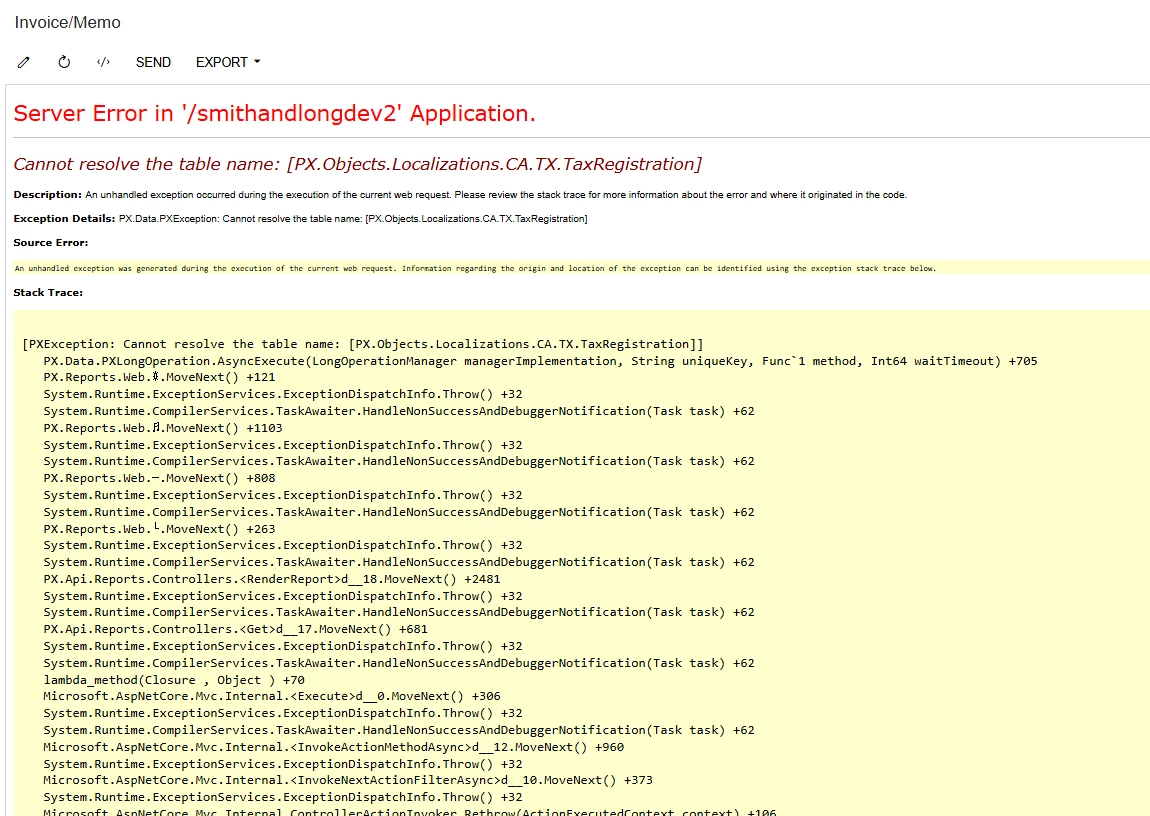 Cannot resolve the table name: [PX.Objects.Localizations.CA.TX.TaxRegistration]