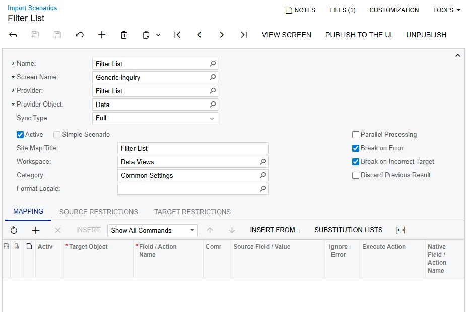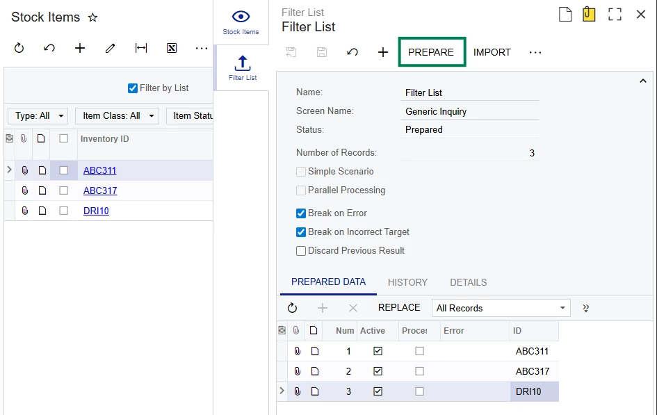 As mentioned before, a large benefit of this method is that it works for filtering any field. It can be an Inventory CD in one GI and then Customer Name in another. It is also a very convenient way to add new lists with a large number of values, since the preparing action in the import scenario clears out old data and replaces it with the new.