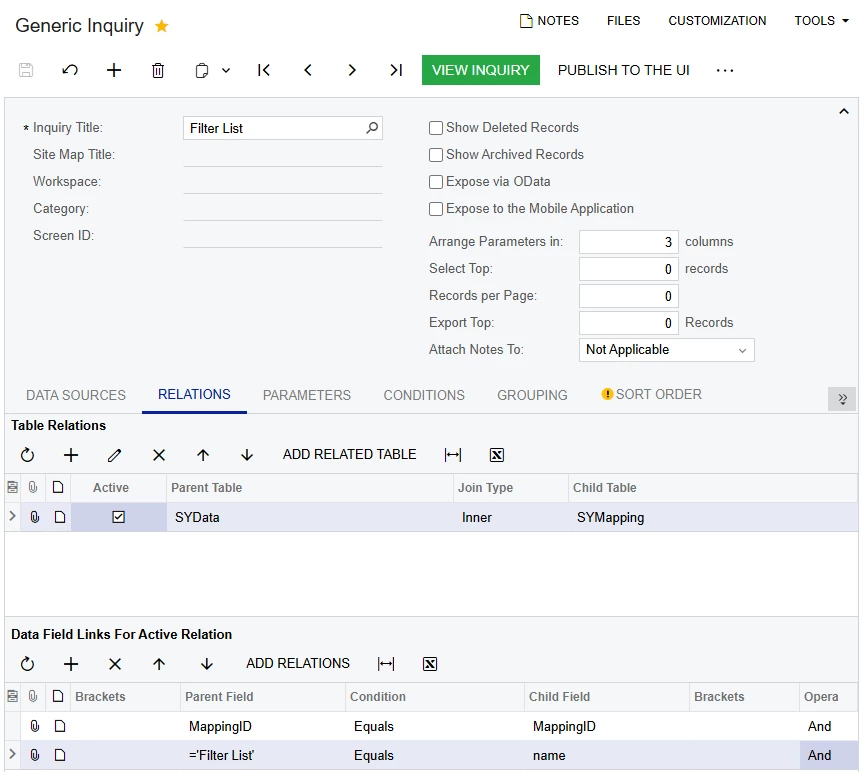 Now that the setup is out of the way, here’s the crux of the trick: PX.Api.SYData. When you prepare an import scenario, those records are loaded and are accessible through this DAC. I made a separate GI to narrow down SYData to the specific import scenario, joining it with SYMapping so I can use the name instead of the unique ID:
