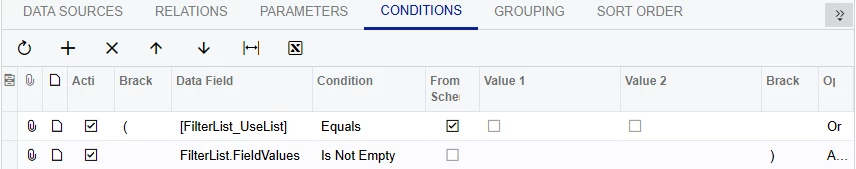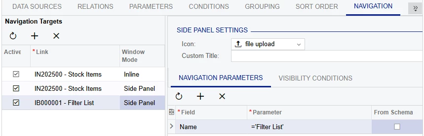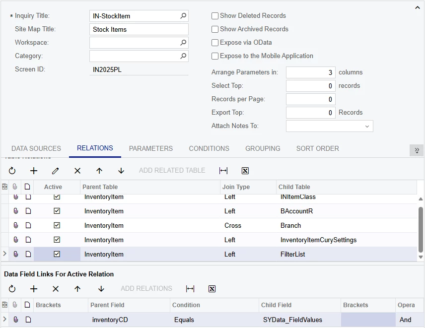 Finally, all is ready to filter a GI by the provided list of values. Add the FilterList GI as a data source and left join it onto the field you want to filter by. For example, let’s assume it’s a list of Inventory CDs for the Stock Items screen.