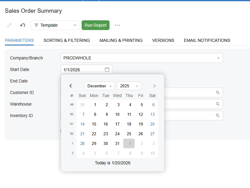 When change date on datetime picker in report back to 2025 but calendar still display in 2026. In Acumatica 2025R2
