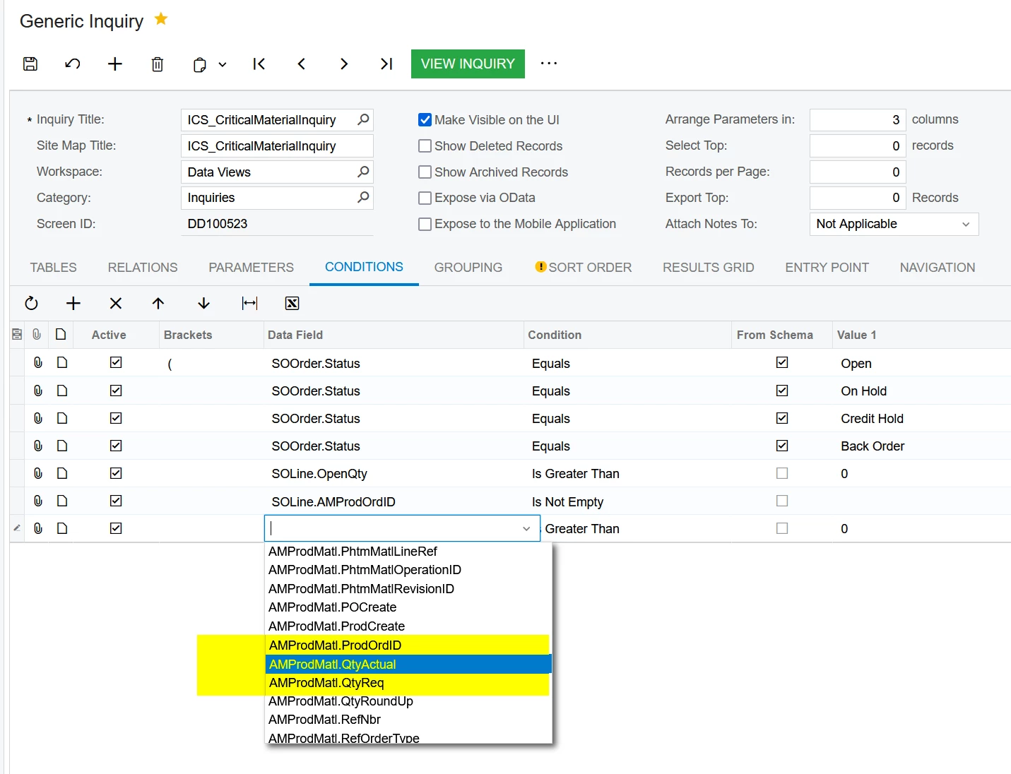 I am trying to create a generic inquiry that has a condition to only show production order lines that have a remaining quantity greater than zero.