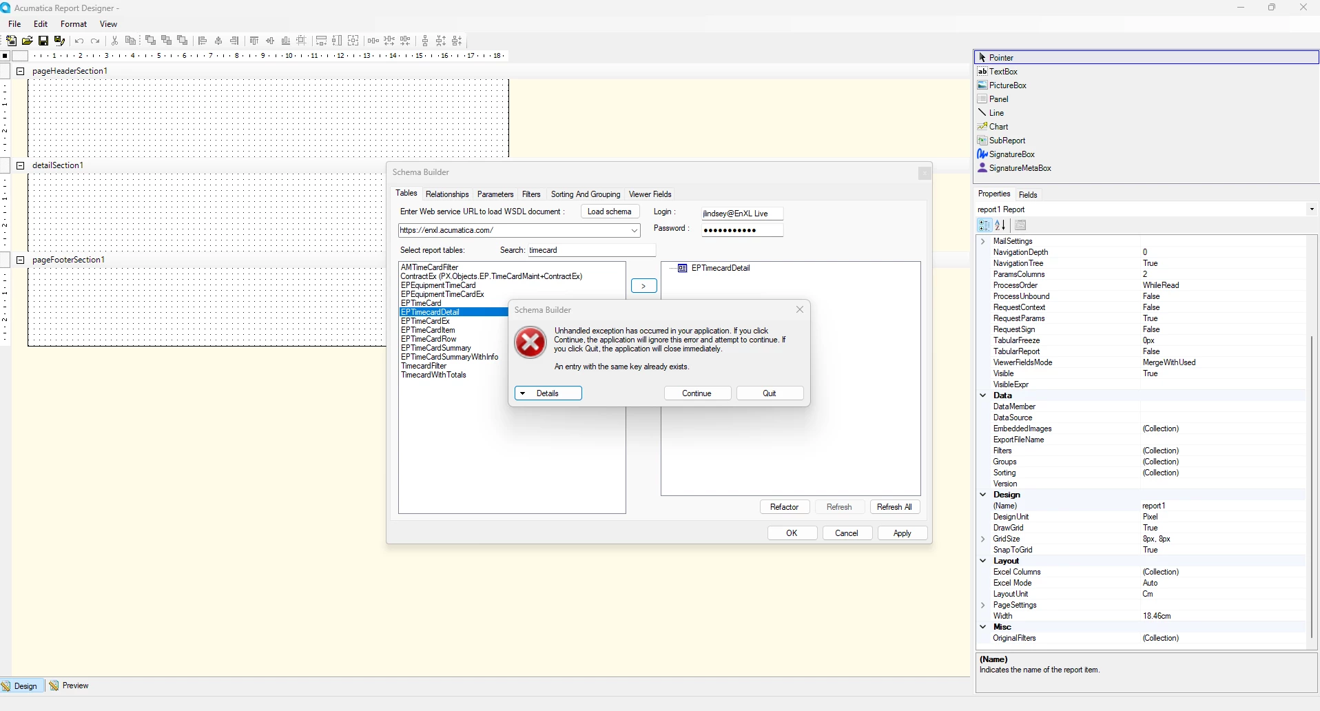I am in report designer and trying to build my schema. Report designer will not let me add specific tables to the schema and I cannot figure out why. I initially thought it was because there was no primary key between EPTimecardDetail and the other table I had in there, but I have removed all tables and am now only adding EPTimecardDetail, and it is still not allowing me to add it and popping up the message “An entry with the same key already exists.” I tried adding other tables associated with time cards and I am unable to add those as well.