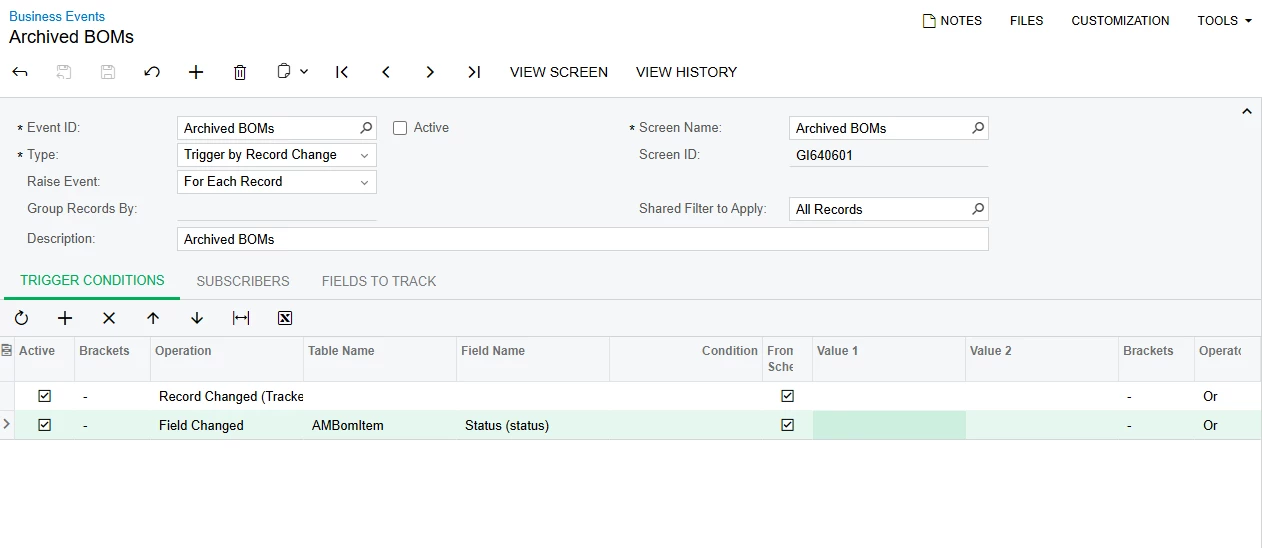 I have created a business event that I want to archive every BOM but the latest one. Can any one give insight as to what the trigger conditions should be? My GI work fine and so does the import scenario, the Business Event is not firing. I also do not want it to archive the newest BOM such as A.